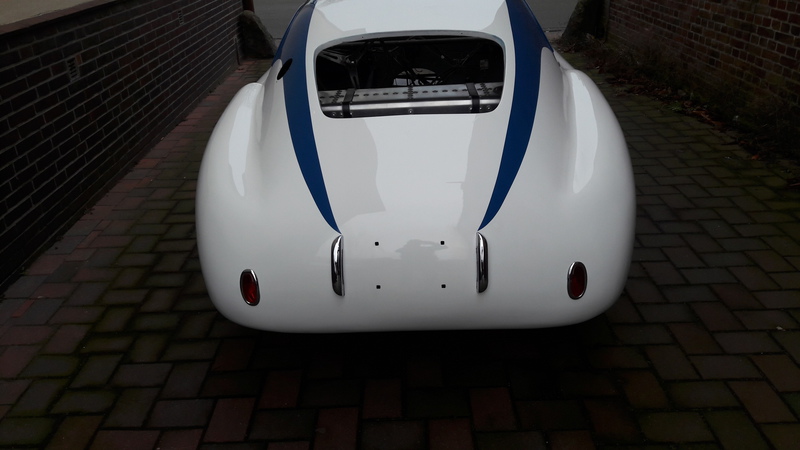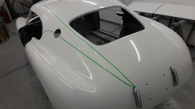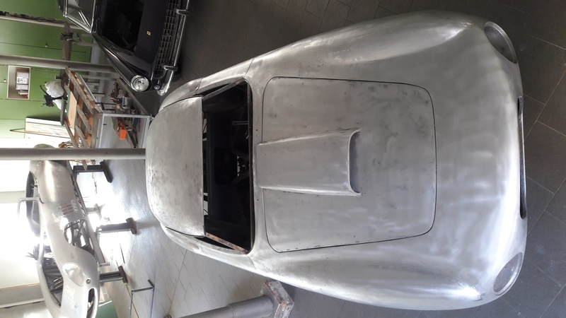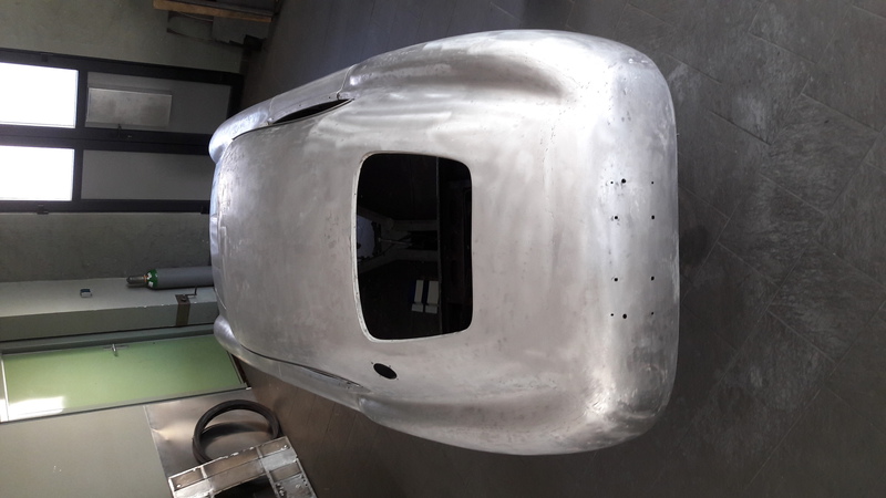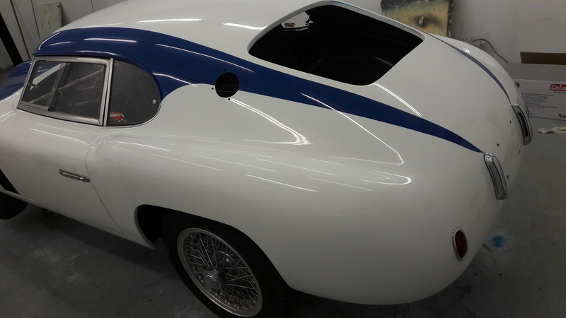 The painfully thin aluminium was further stressed by paint removal from a previous "restoration" with a large linishing disc, however we were able to restress the skin, remove all dents and paint the car in its original colours in nitro cellulose and, as with all our body/paintwork, no filler required.